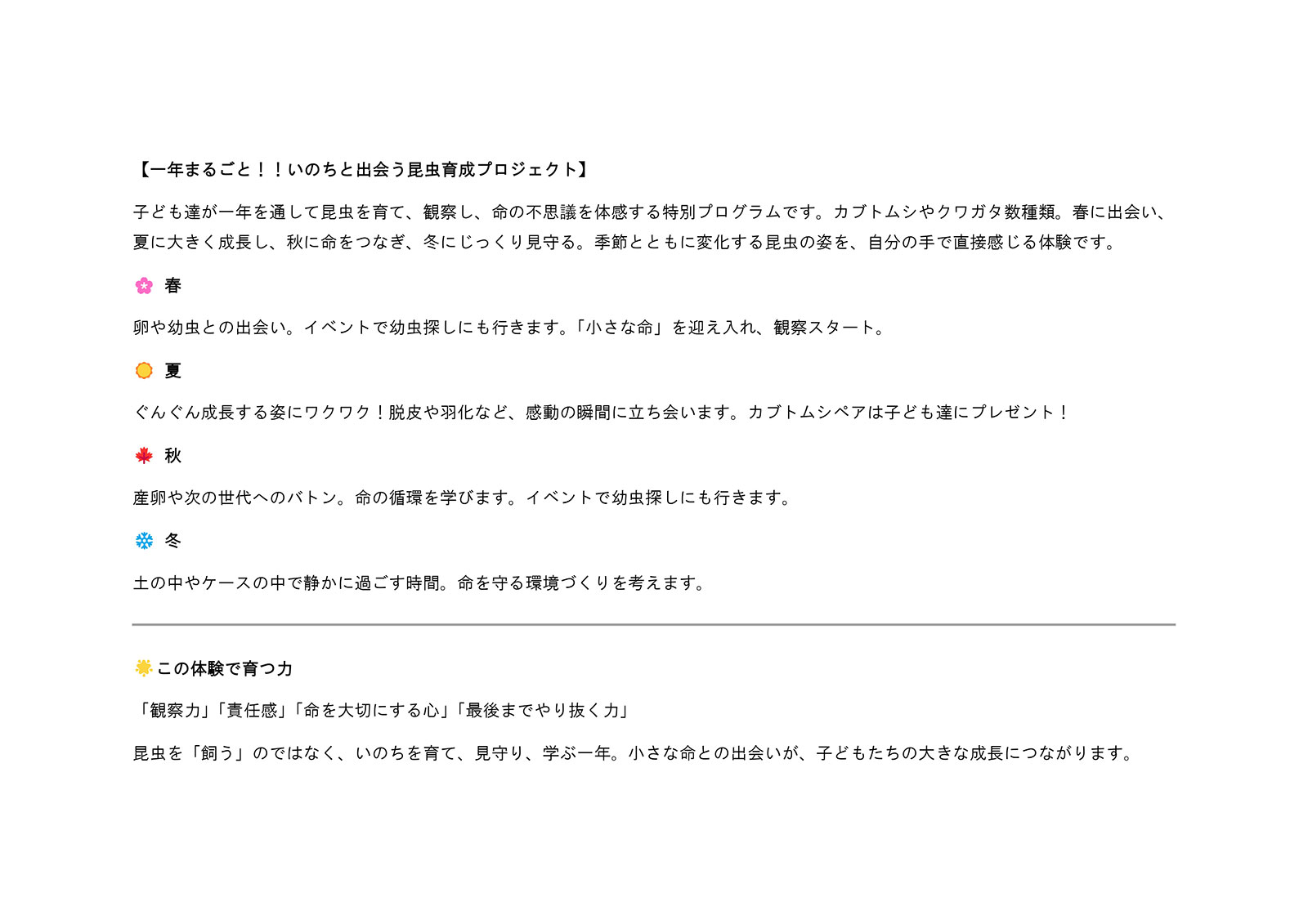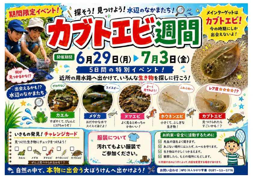子ども達が興味や関心のある野外活動と小集団授業を組み合わせた「本物体験学習」の機会を提供します。 午前中の授業で主体的に学び考えた事を、野外活動で試したり、その確認をしたりして、驚きや感動と共に考える力を育みます。
