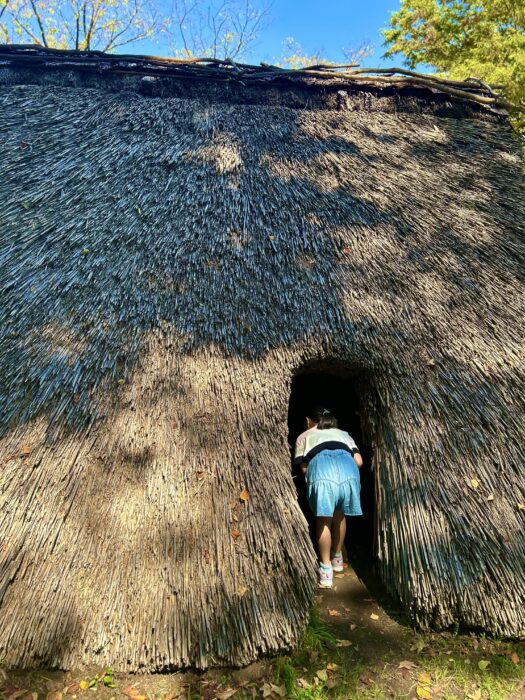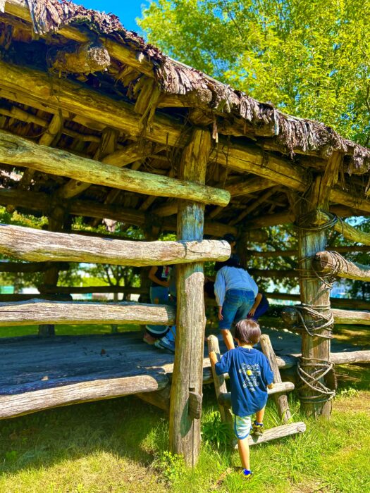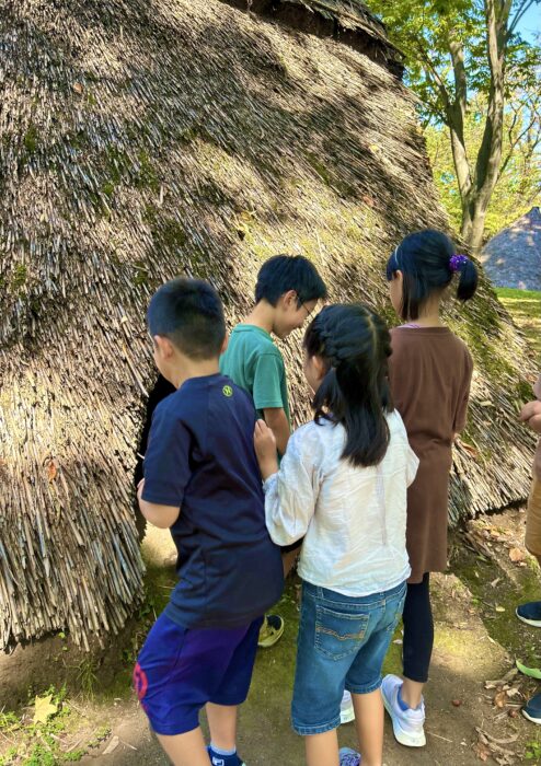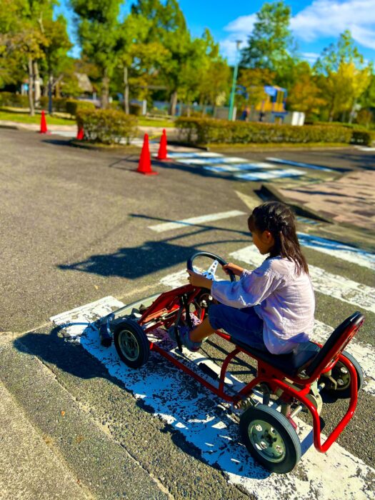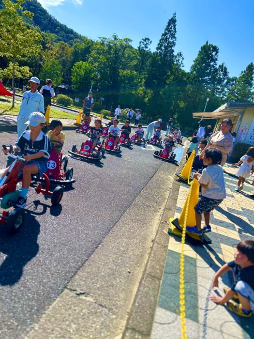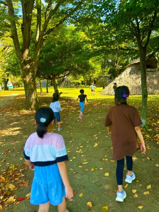 どんぐり拾い、遺跡探検(竪穴式住居に入ってみる)、野原で鬼ごっこ、生き物探し、アスレチック遊具で粗大運動、ゴーカートを楽しみながら交通ルールを学ぶ。