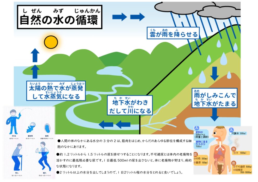 ・「自然の水の循環」「海岸に流れ着く物」「人間の体には何パーセントの水があるのか」「1日に水分はどれくらい出て、どれくらい摂るのか」「1ℓってどれくらい?」「60%ってどういう意味?」