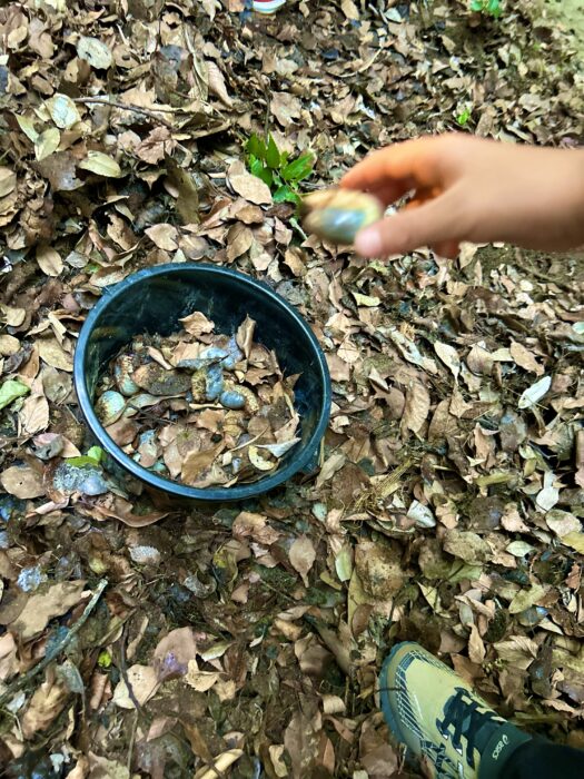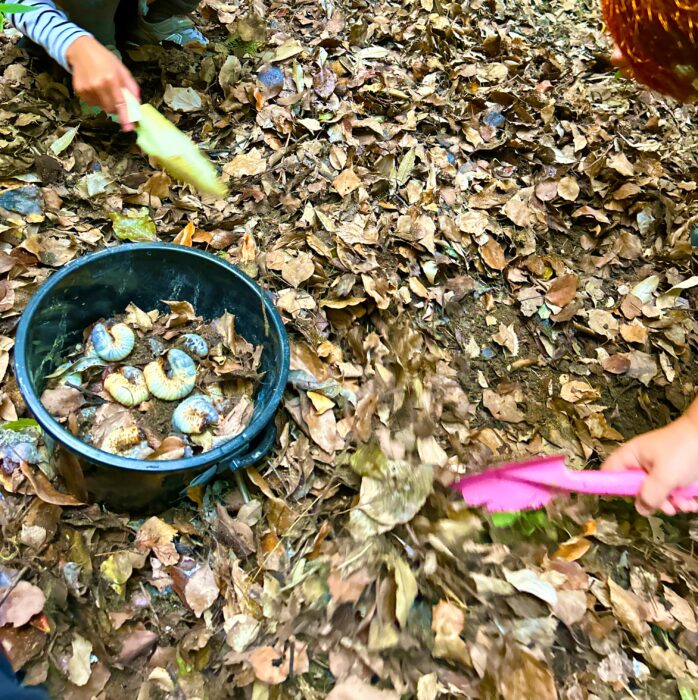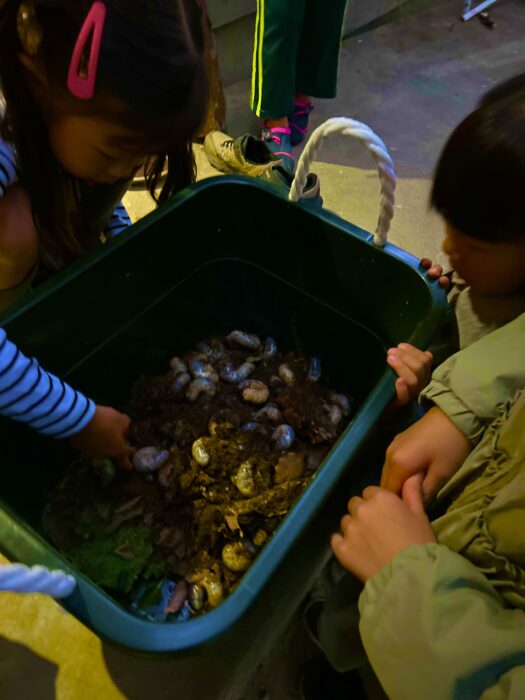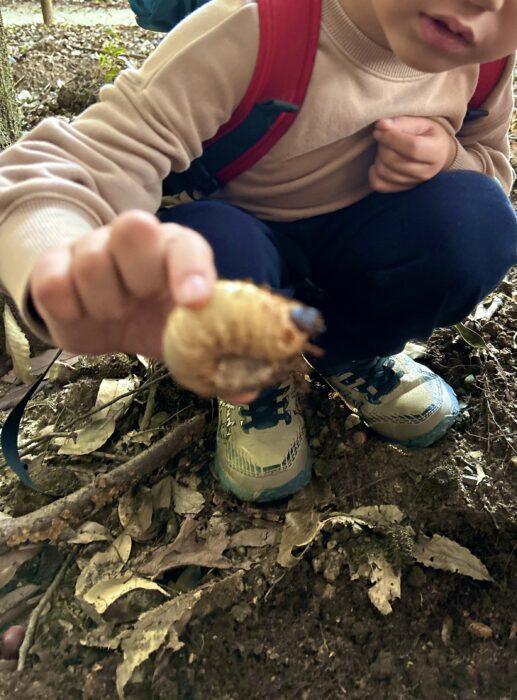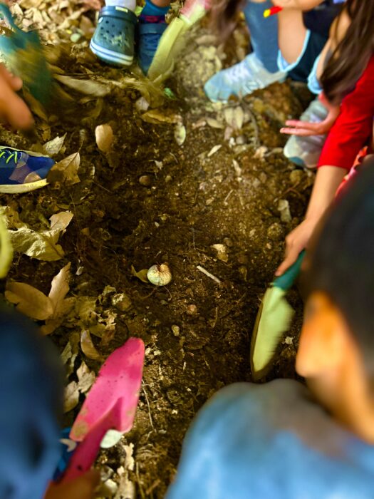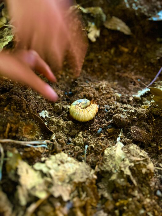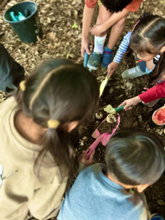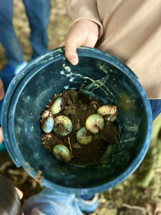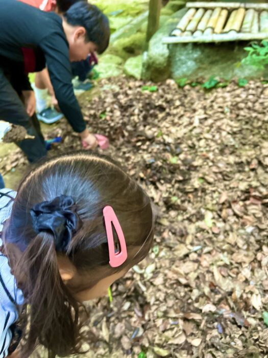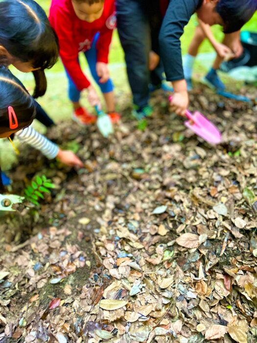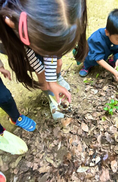 子ども達の要望で先週決まった本日(平日降園後・放課後)の「カブト虫の幼虫探し」。「見つからないかもしれないよ」との前提で、林や神社の雑木林を散策しに行きました。どちらの場所とも施設としての利用許可を事前にいただいています。ゴロゴロと出てきて、子ども達は大喜びでした。「触れなかったけど、はじめて手でつかめた」という子もいましたよ。みんなモチベーションがあれば、なんでも乗り越えられるよ!大丈夫!!