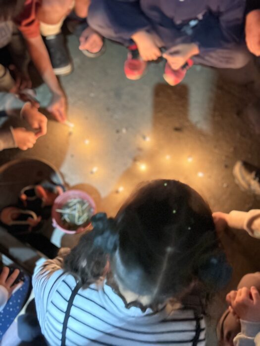寒くなってきたね!ローソクに点けた火で温まると共に、ささやかなイルミネーションをみんなで楽しみました。(こういう機会で、マッチの扱いや火の怖さ等を伝えています。)