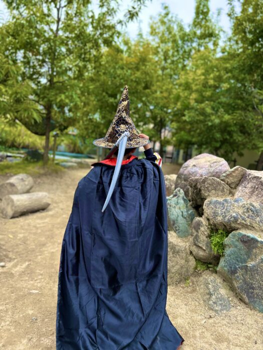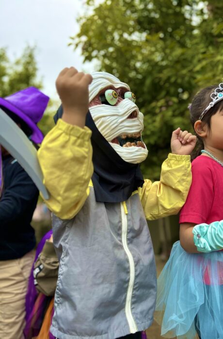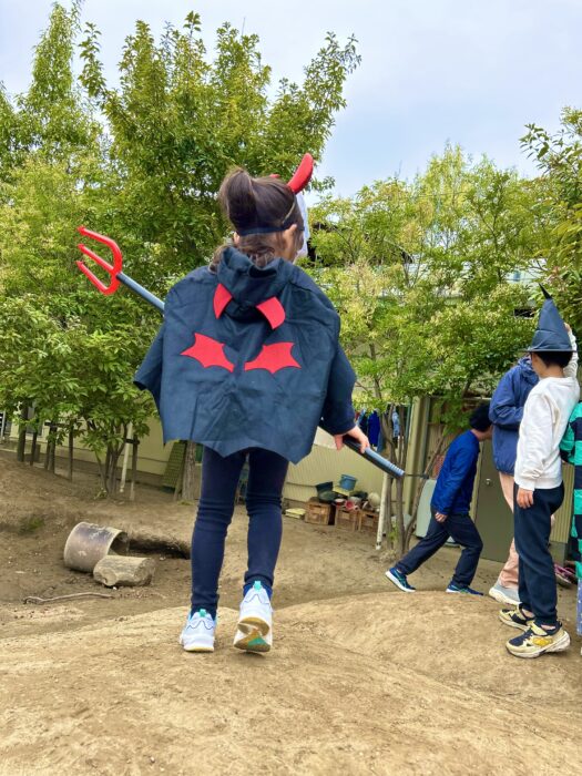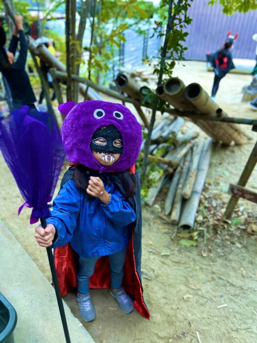 3神社で遊びを見つけよう(コイのエサやり、大音響でみんなでダンス、木の枝探し、松ぼっくり探し等)