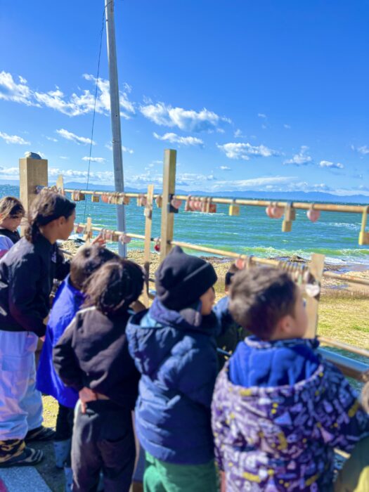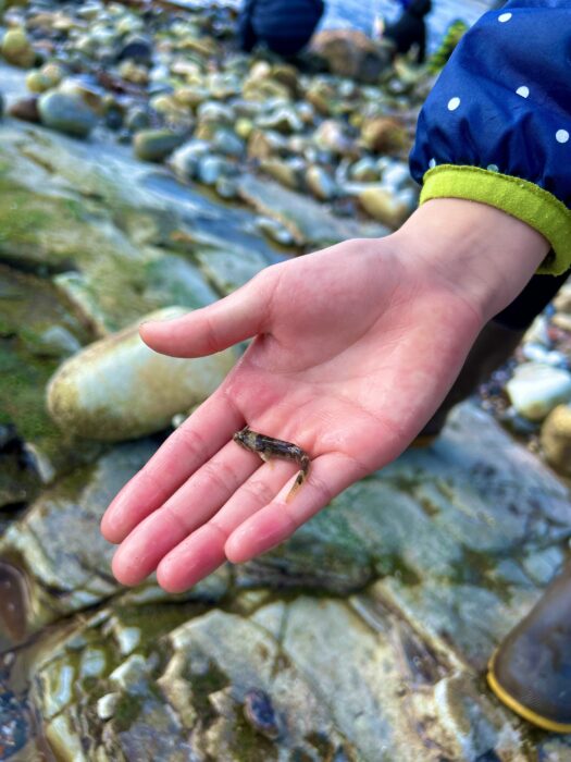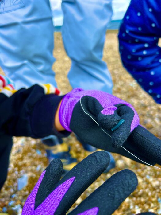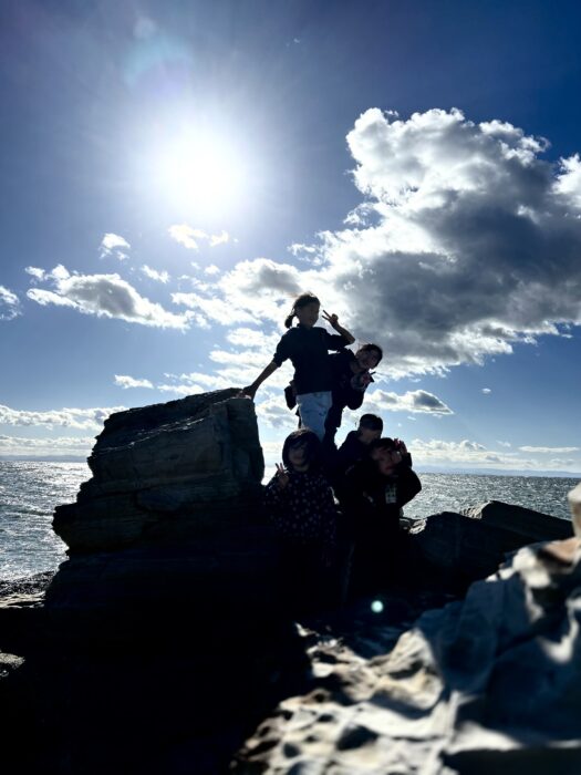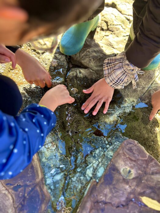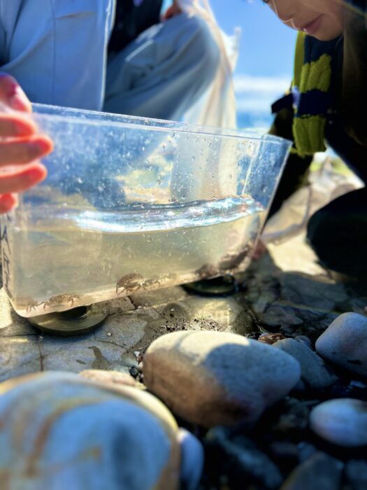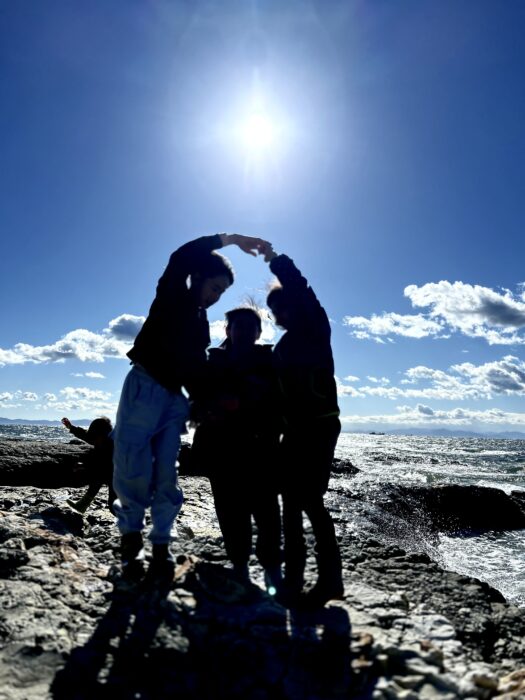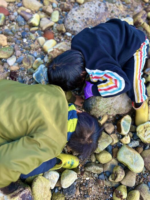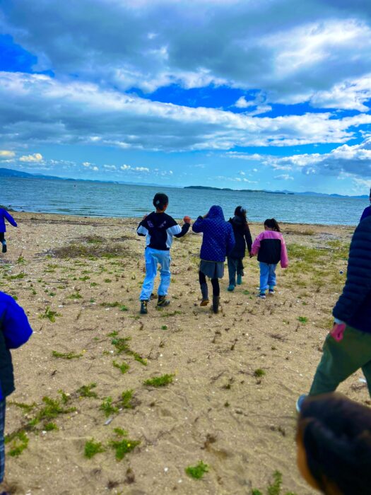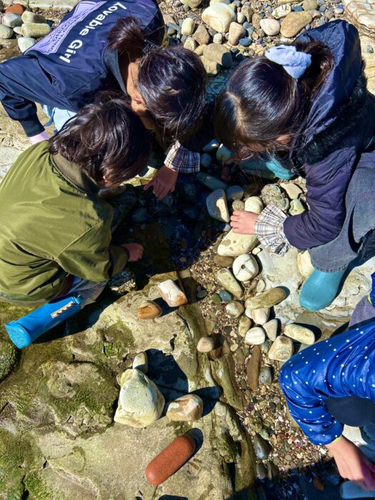③ビーチコPOINT2 シーグラスや貝、面白い形の石等を探しました。サンゴやヒトデ、多くのシーグラスが見つかりました。ちょうど干潮のタイミングで、たくさんのカニや小魚等も捕まえることが出来ました。無料で駐車場を貸していただいた海岸沿いのお店にはみんなであいさつに行きました。