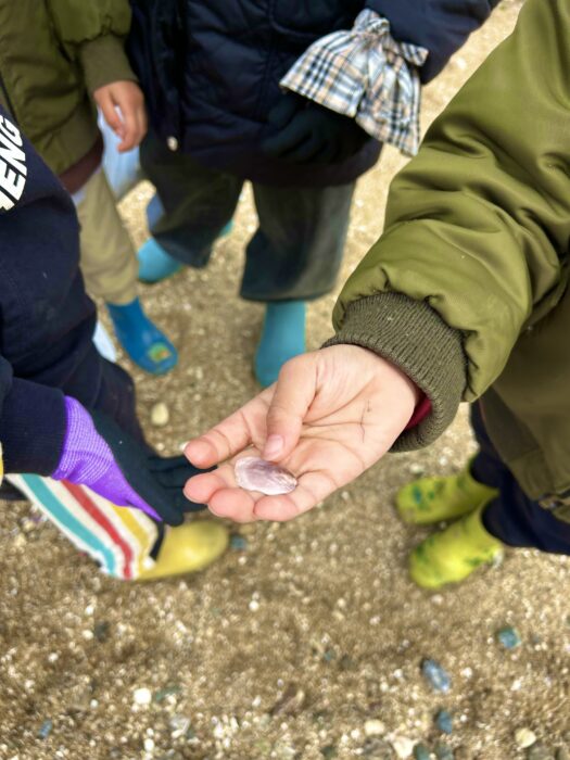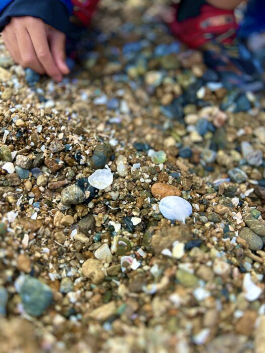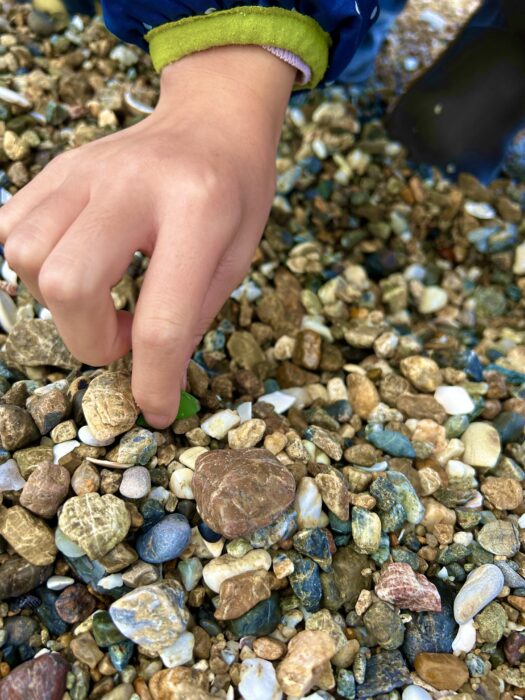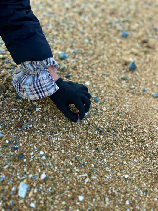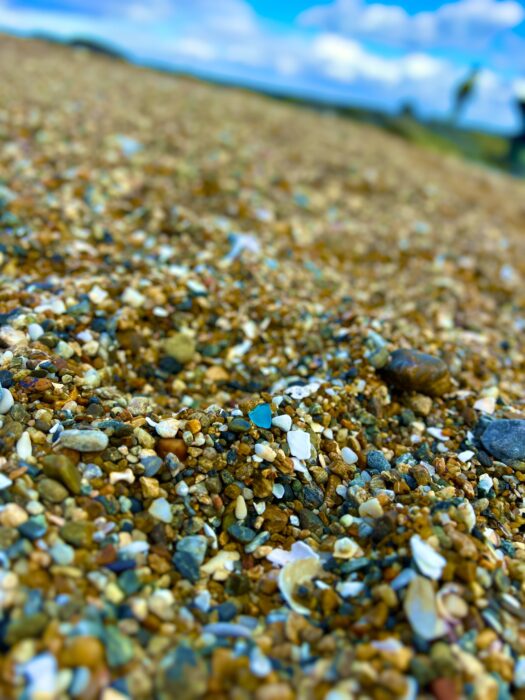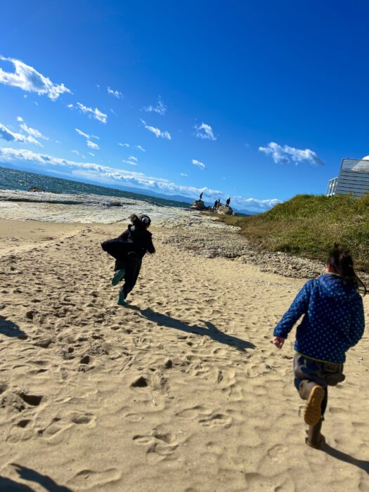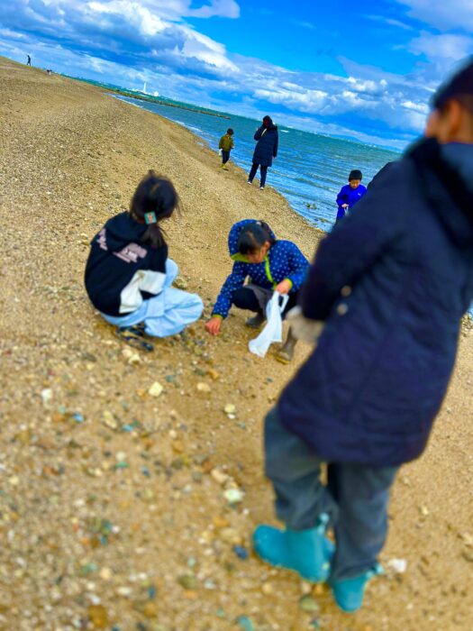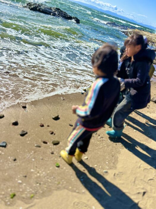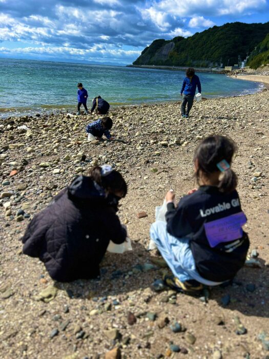 ②ビーチコPOINT1 シーグラスや貝、面白い形の石等を探しました。大小様々なシーグラスが見つかりました。無料で駐車場を貸していただいた海岸沿いのお店にはみんなであいさつに行きました。