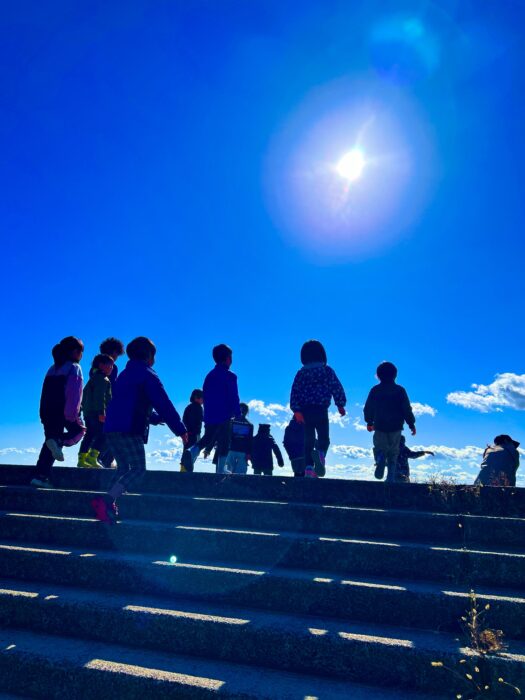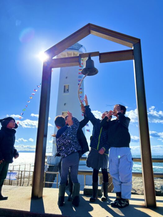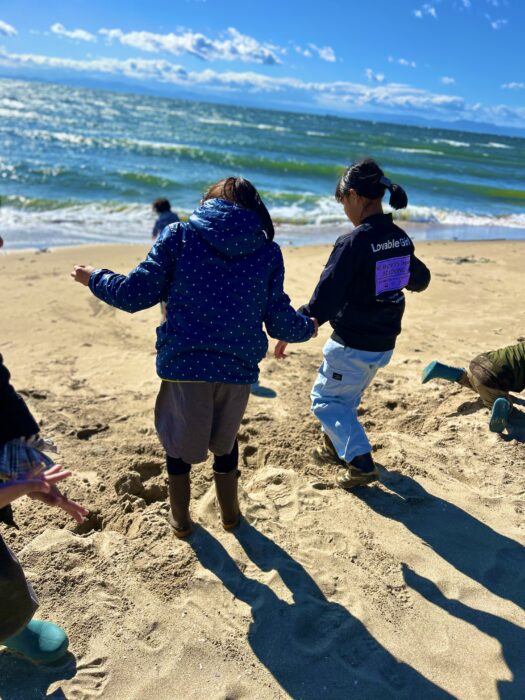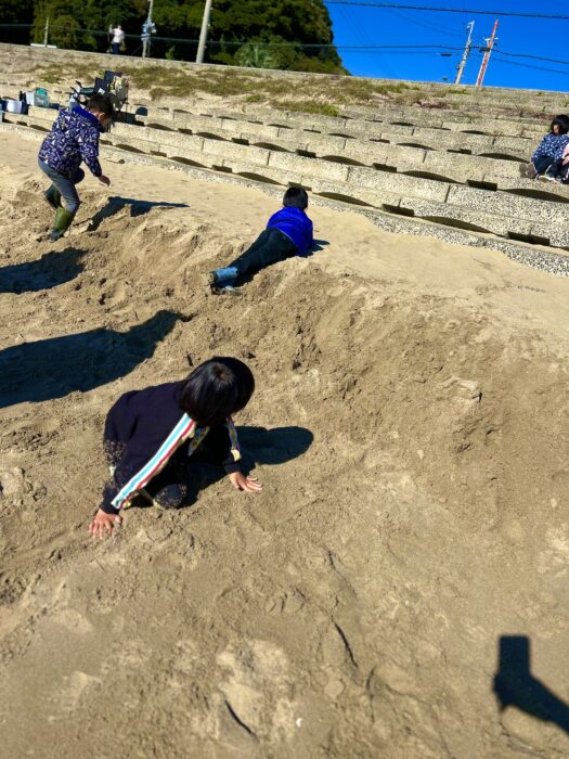 ⑤野間灯台で磯遊び サラサラの砂の山や斜面、波との追いかけっこ、波打ち際の砂に落書き、流れ着いた大きな木や木片等で、楽しみました。