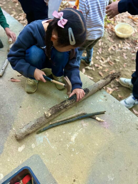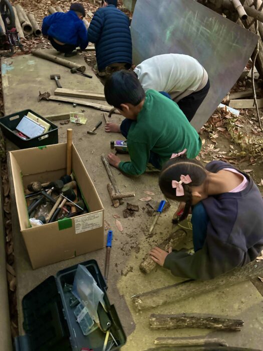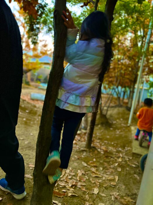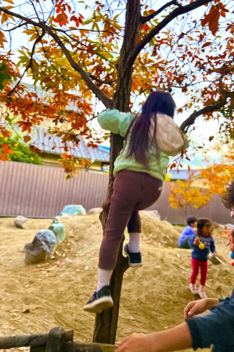 11月最終週平日の様子です。園庭では、様々な事に取り組みます。子ども達は、自分の興味や関心に従い、遊びを見つけ、決め、行動します。活動内容によっては、怪我のリスクやお友達トラブルもありえるので、職員が必ず見守りを行っています。(指導員は、野外活動の見守りの研修を受けた正職員のみ)