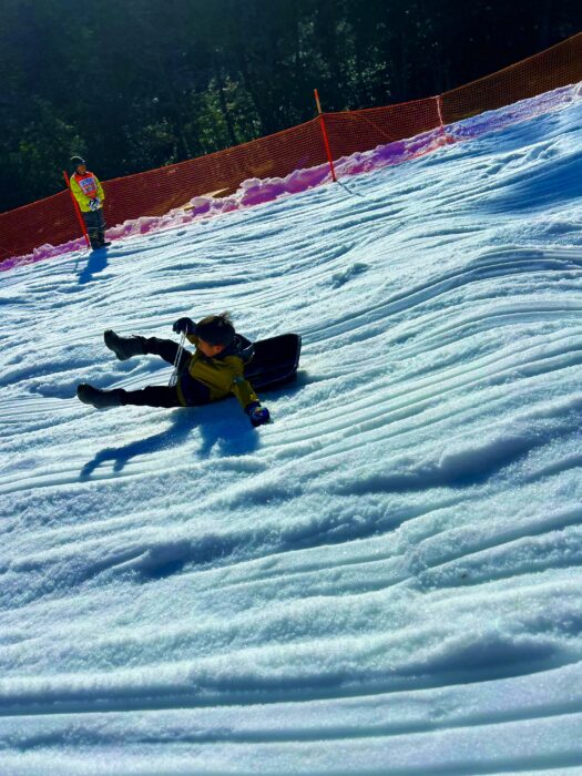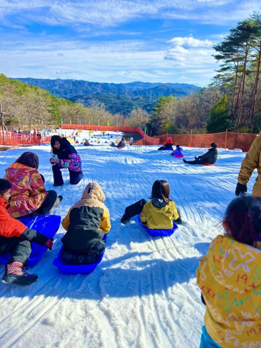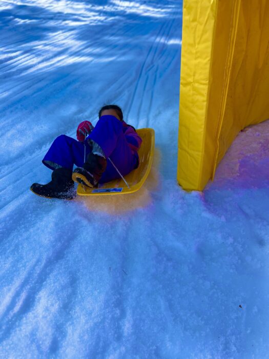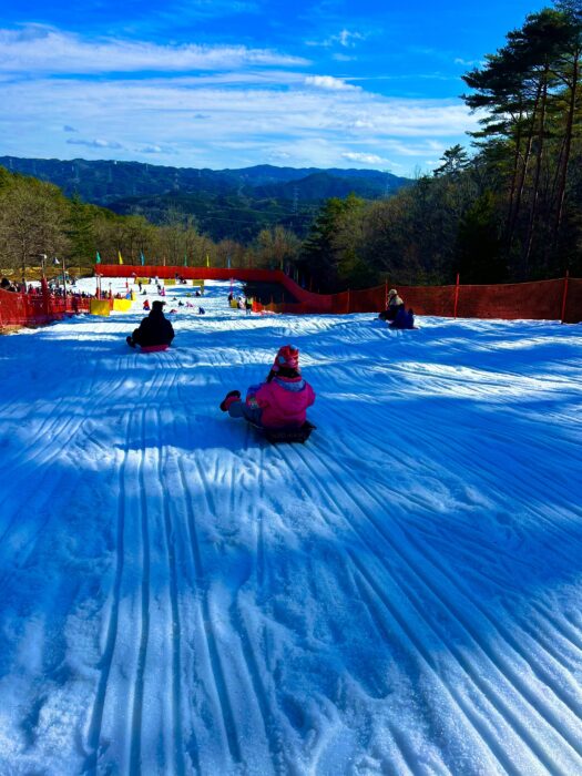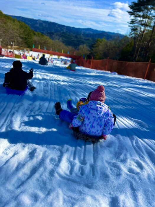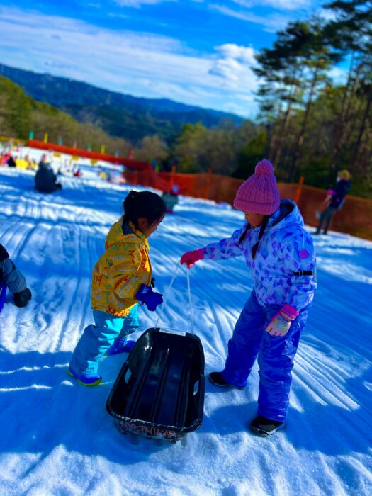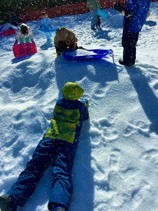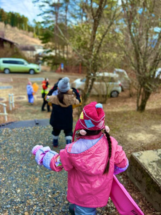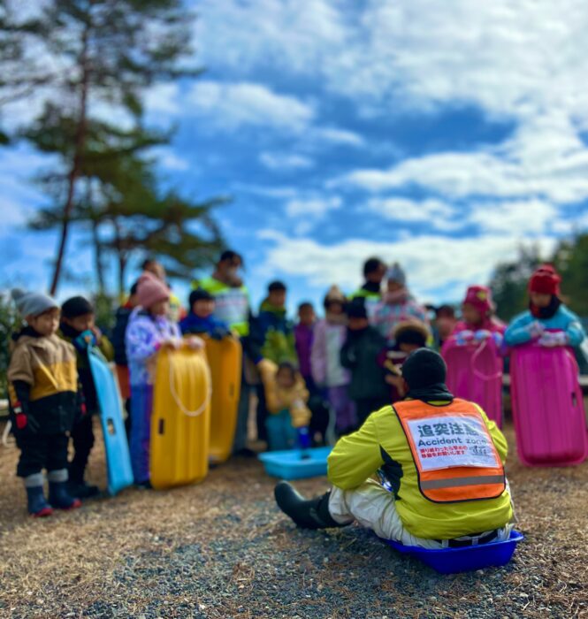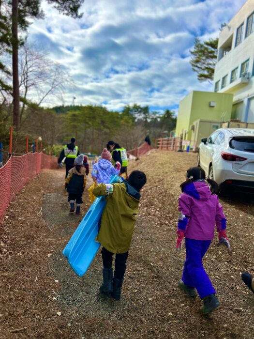 ソリの滑り方、「動く歩道」の乗り方等、説明をうけたルールを意識して行動が出来ました。友だちと順番を守ったり、「一緒に滑ろう」と声を掛け合ったりする場面もあり、遊びを通して協調性や挑戦する気持ちを育む良い機会となりました。自然の中で体を思い切り動かし、達成感や楽しさを十分に味わうことが出来ました。