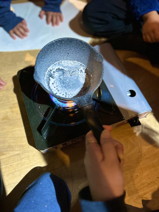 ②煮詰める: ろ過した海水を鍋に入れ、強火で煮詰め、水分が蒸発させました。