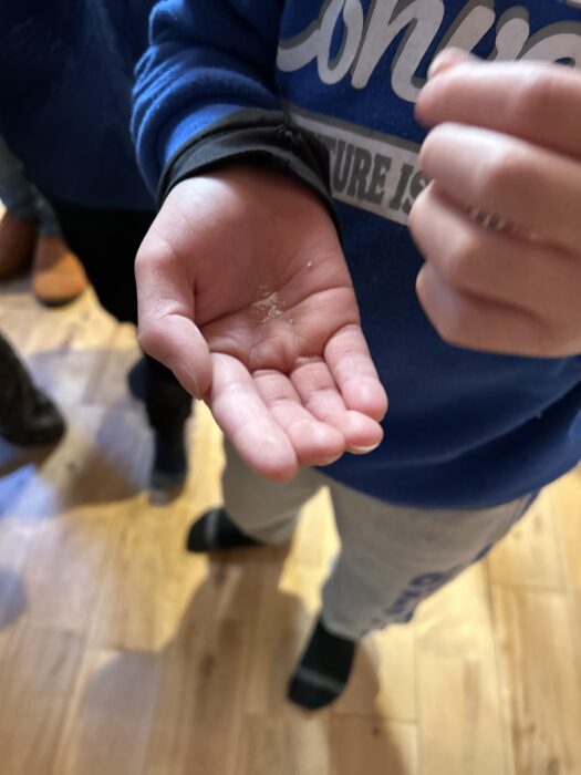 ▶この方法で、海水2ℓあたり約50gの塩が作れます。クイズ>1ℓあたりでは何g?500mlあたりでは何g?作れるのかな?とみんなで考えてみました。1ℓは牛乳パック1つ分のことだよぉ。