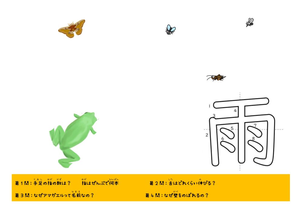カエルの手足指の数は?、絵に描いてみよう、人間の手指足指の数と比べる、全部でいくつか数えてみる、舌の長さは11.5倍、体が4㎝のカエルなら舌の長さは?、アマガエルの名前の由来、漢字「雨」をイメージフィックス法で覚える練習、壁を登れる秘密を考える、カエルの手を紙で作り、壁に貼り付けてみる(水による摩擦)