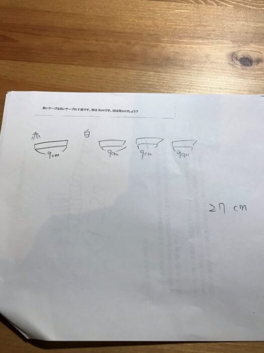 問題:赤いテープは白いテープの3倍です。赤は9cmです。白は何cmでしょう。