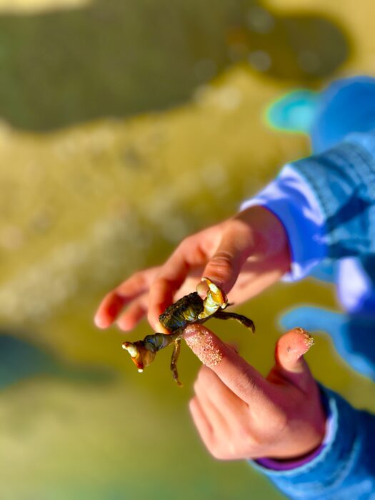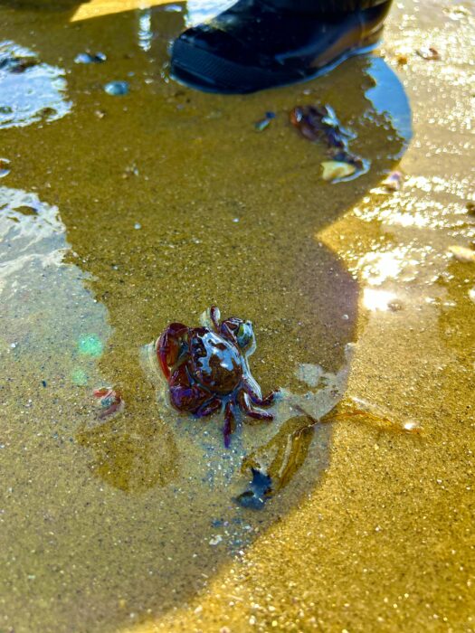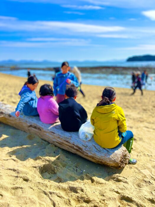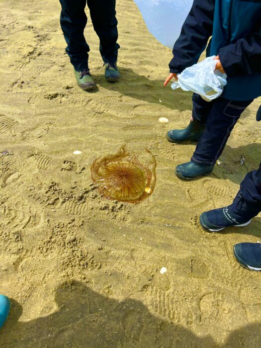 現地では、カニやクラゲ、砂モグリ、ナマコ、ウニ、ヒトデ等、様々な海の生き物と出会うことができ、子どもたちは興味津々で観察したり、そっと触れてみたりと、それぞれの関わり方で自然と向き合っていました。中には「自然の中で生きているクラゲを初めて見た」と話してくれる子もおり、貴重な体験となりました。