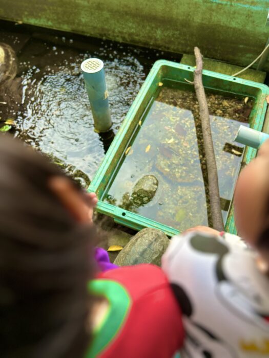 ⑥事業所の生け簀へ亀を放す